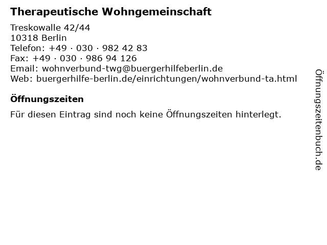 1 Bürgerhilfe Kultur des Helfens gGmbH STWG/BEW Lichtenberg Betreute Wohngemeinschaft (Entfernung: 0,01 km) Treskowallee 42, 10318 Berlin 2 Bürgerhilfe Kultur des Helfens gGmbH STW/BEW Lichtenberg Betreute Wohngemeinschaft (Entfernung: 1,09 km) Erich-Kurz-Straße 9, 10319 Berlin 6 |