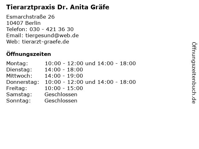 2 Tierarztpraxis Dr. med.vet. Gerhard Müller Notrufnummer (Entfernung: 2,33 km) Ackerstr. 149, 10115 Berlin 3 Tierarztpraxis Dr. med. vet. Cordula Nitschke (Entfernung: 2,38 km) Max-Steinke-Straße 2, 13086 Berlin 6 |