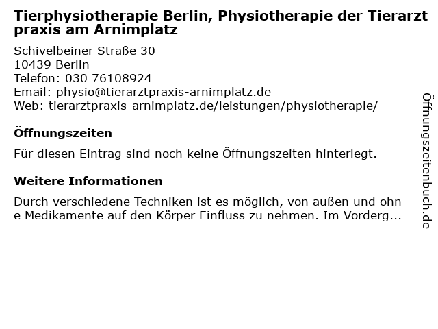 | Tierphysiotherapie Berlin, Physiotherapie der Tierarztpraxis am Arnimplatz anrufen | |