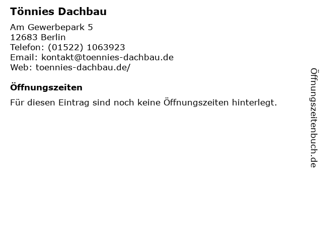 | Öffnungszeiten Tönnies Dachbau in Berlin anzeigen | |