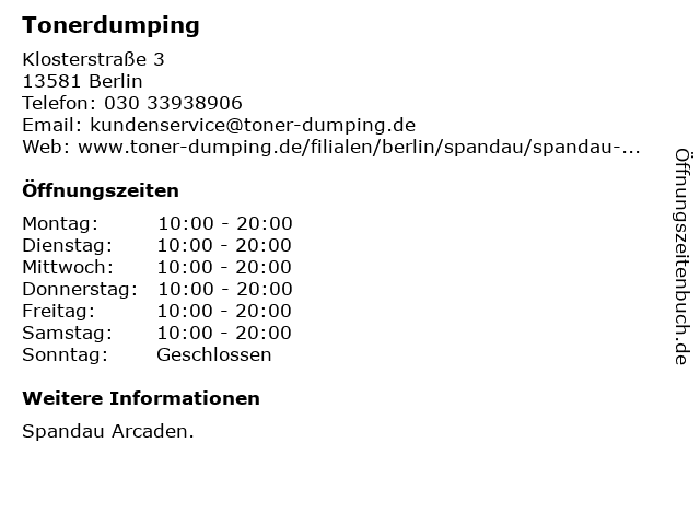 | Öffnungszeiten Tonerdumping in Berlin anzeigen | |