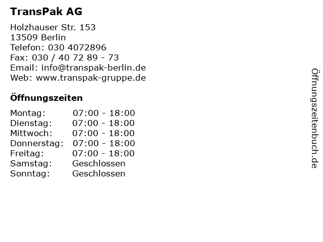 | Öffnungszeiten TransPak AG in Berlin anzeigen | |