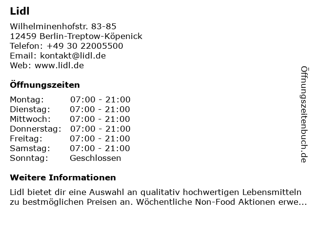 | Öffnungszeiten Lidl in Berlin-Treptow-Köpenick anzeigen | |
