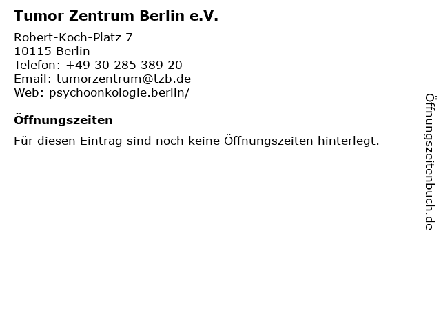 | Öffnungszeiten Tumor Zentrum Berlin e.V. in Berlin anzeigen | |