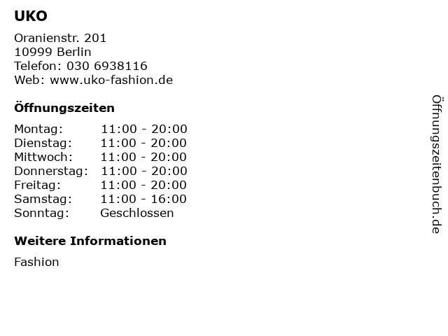 | Öffnungszeiten UKO in Berlin anzeigen | |