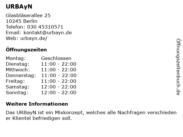 | Öffnungszeiten URBAyN in Berlin anzeigen | |