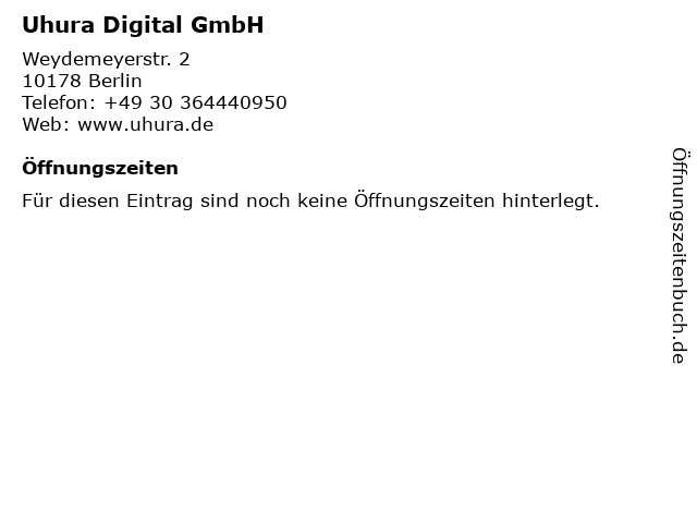 | Öffnungszeiten Uhura Digital GmbH in Berlin anzeigen | |