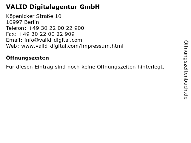 | Öffnungszeiten VALID Digitalagentur GmbH in Berlin anzeigen | |