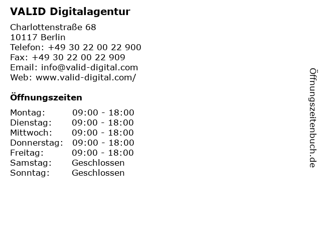 | Öffnungszeiten VALID Digitalagentur in Berlin anzeigen | |
