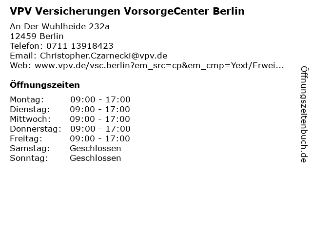Öffnungszeiten VPV Versicherungen VorsorgeCenter Berlin