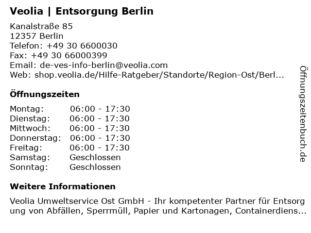 | Öffnungszeiten Veolia | Entsorgung Berlin in Berlin anzeigen | |