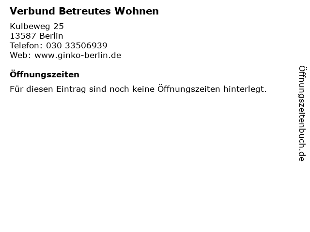 | Öffnungszeiten Verbund Betreutes Wohnen in Berlin anzeigen | |