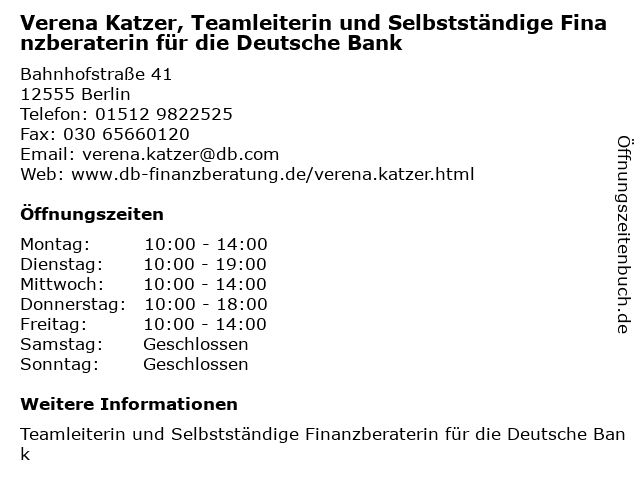 Branchen & Suchbegriffe zu Verena Katzer, Teamleiterin und Selbstständige Finanzberaterin für die Deutsche Bank:bank, deutsche, finanzberaterin, katzer, selbstständige, teamleiterin, verena |