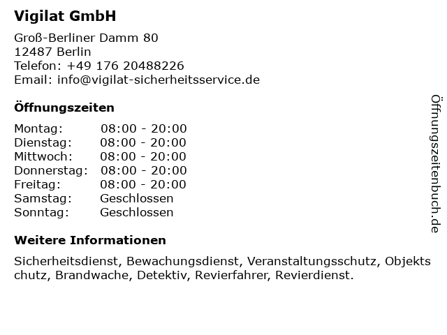 | Öffnungszeiten Vigilat GmbH in Berlin anzeigen | |