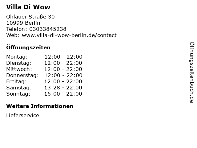 | Öffnungszeiten Villa Di Wow in Berlin anzeigen | |