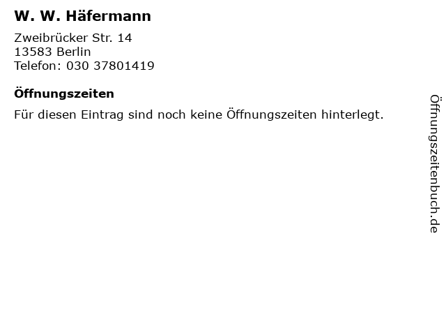 | Öffnungszeiten W. W. Häfermann in Berlin anzeigen | |