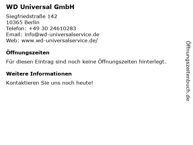 | Öffnungszeiten WD Universal GmbH in Berlin anzeigen | |
