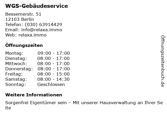 Öffnungszeiten WGS-Gebäudeservice in Berlin anzeigen | |