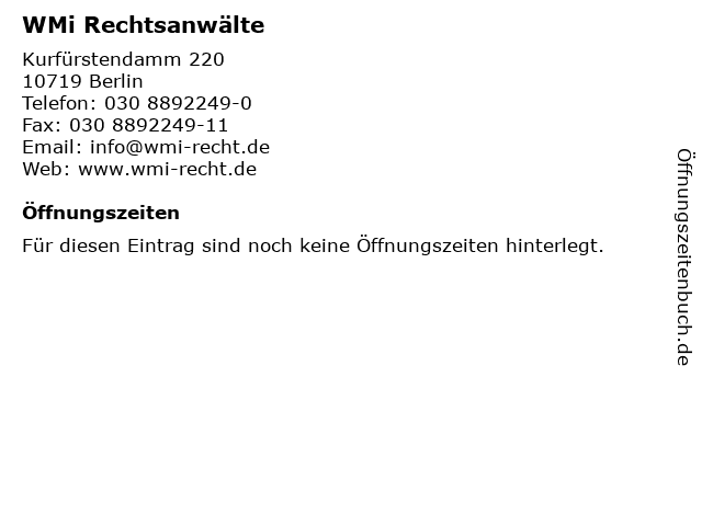 | Öffnungszeiten WMi Rechtsanwälte in Berlin anzeigen | |