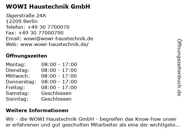 | Öffnungszeiten WOWI Haustechnik GmbH in Berlin anzeigen | |