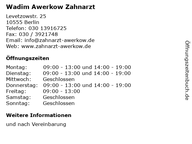 | Öffnungszeiten Wadim Awerkow Zahnarzt in Berlin anzeigen | |