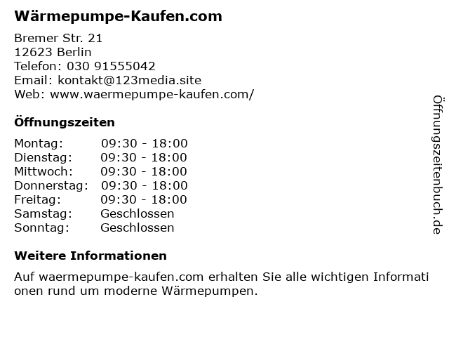 | Öffnungszeiten Wärmepumpe-Kaufen.com in Berlin anzeigen | |