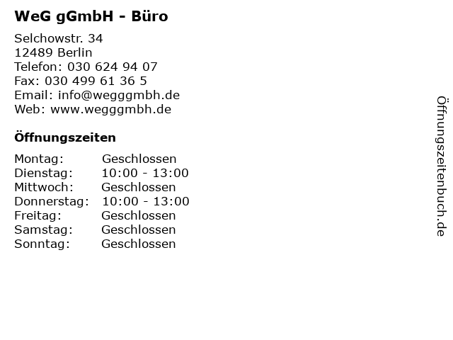 | Öffnungszeiten WeG gGmbH - Büro in Berlin anzeigen | |