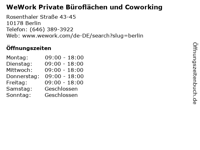 1 WeWork Private Büroflächen und Coworking (Entfernung: 0,15 km) Neue Schönhauser Straße 3-5, 10178 Berlin 6 |