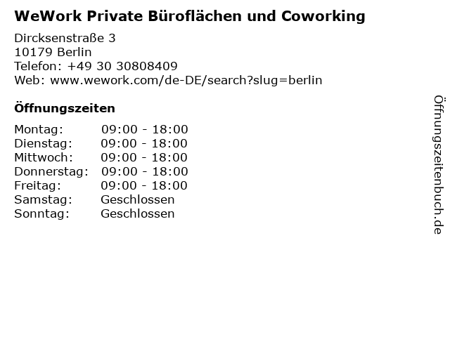 1 WeWork Private Büroflächen und Coworking (Entfernung: 1,21 km) Neue Schönhauser Straße 3-5, 10178 Berlin 2 WeWork Private Büroflächen und Coworking (Entfernung: 1,25 km) Rosenthaler Straße 43-45, 10178 Berlin 6 Bundesberatungszentrale für private Krankenversicherung (Entfernung: 0,49 km) Alexanderplatz 2, 10178 Berlin |