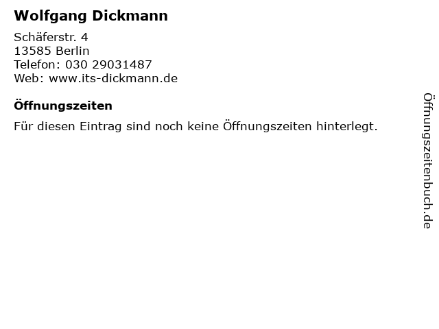 | Öffnungszeiten Wolfgang Dickmann in Berlin anzeigen | |