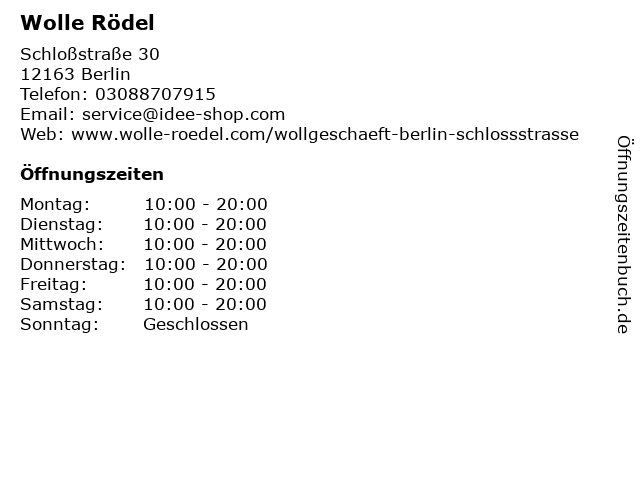 | Öffnungszeiten Wolle Rödel in Berlin anzeigen | |