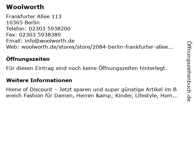 | Öffnungszeiten Woolworth in Berlin anzeigen | |