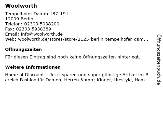 | Öffnungszeiten Woolworth in Berlin anzeigen | |