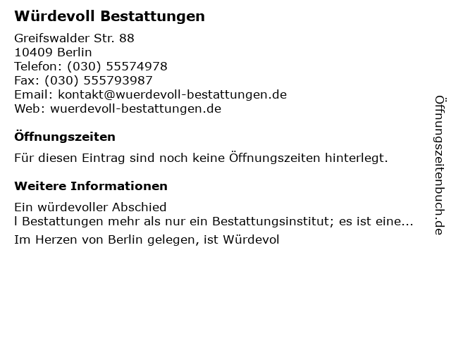 | Öffnungszeiten Würdevoll Bestattungen in Berlin anzeigen | |