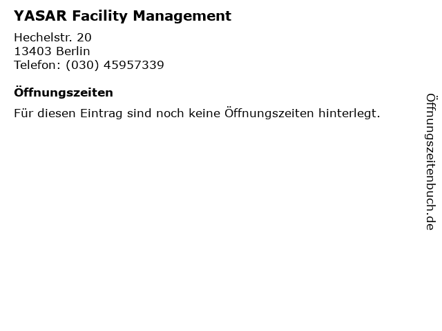 | Öffnungszeiten YASAR Facility Management in Berlin anzeigen | |