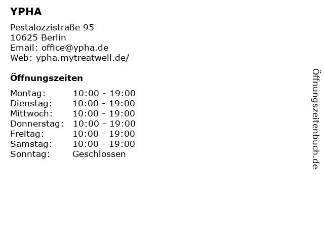 | Öffnungszeiten YPHA in Berlin anzeigen | |
