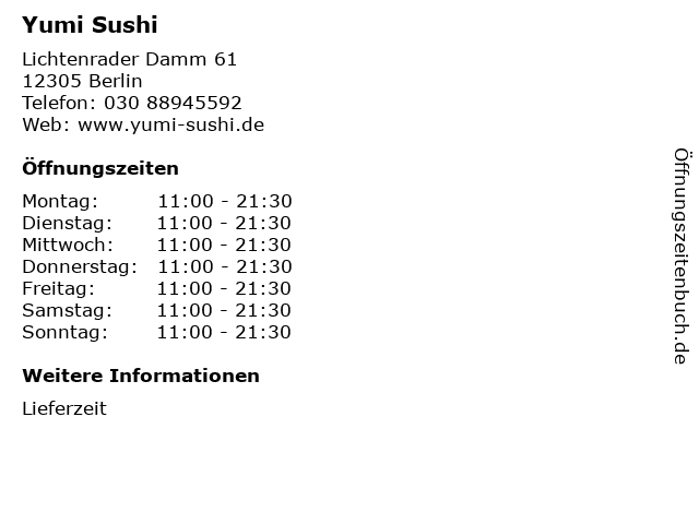 | Öffnungszeiten Yumi Sushi in Berlin anzeigen | |