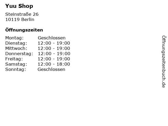 | Öffnungszeiten Yuu Shop in Berlin anzeigen | |