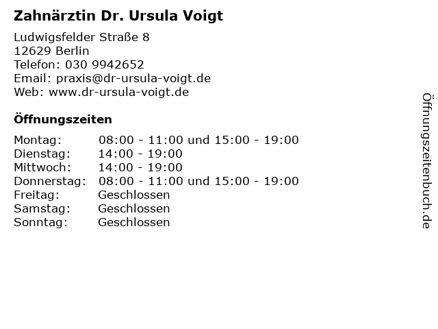 | Öffnungszeiten Zahnärztin Dr. Ursula Voigt in Berlin anzeigen | |