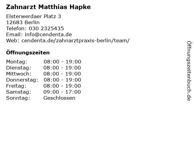| Öffnungszeiten Zahnarzt Matthias Hapke in Berlin anzeigen | |