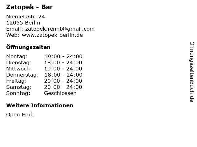 | Öffnungszeiten Zatopek - Bar in Berlin anzeigen | |