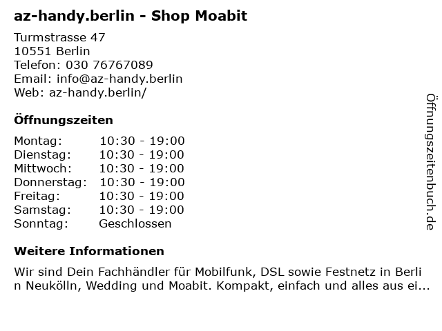 | Telefonnummer az-handy.berlin - Shop Moabit in Berlin (030 76767089) anrufen | |