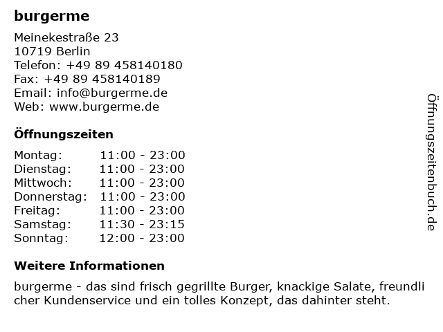 | Öffnungszeiten burgerme in Berlin anzeigen | |