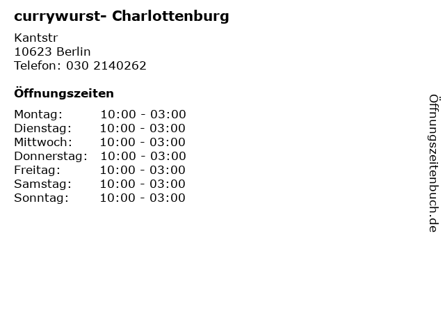 | Öffnungszeiten currywurst- Charlottenburg in Berlin anzeigen | |