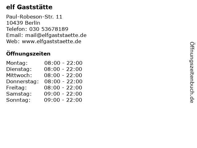 | Öffnungszeiten elf Gaststätte in Berlin anzeigen | |