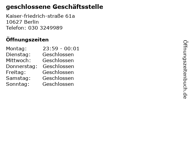 | Telefonnummer geschlossene Geschäftsstelle in Berlin (030 3249989) anrufen | |