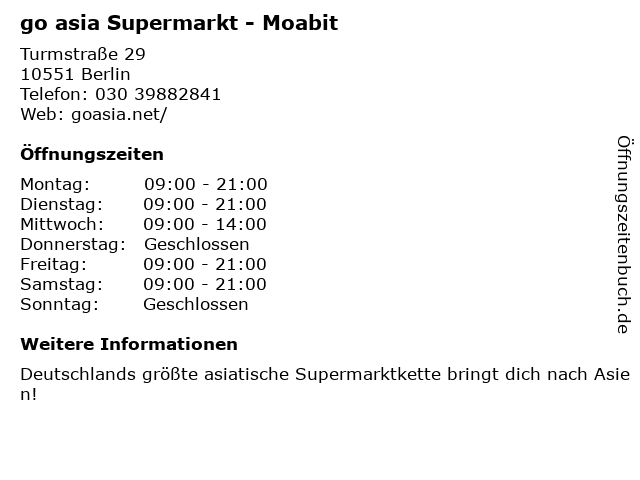 | Öffnungszeiten go asia Supermarkt - Moabit in Berlin anzeigen | |