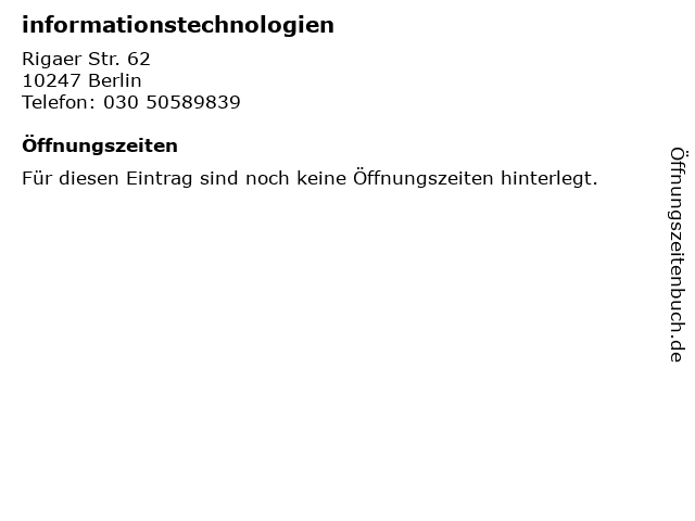 | Öffnungszeiten informationstechnologien in Berlin anzeigen | |