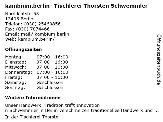 1 Gerald Geisler Tischlerei - Mitarbeiter und Werkstatt (Entfernung: 0,18 km) Venusstr. 4, 13405 Berlin 2 Tischlerei K & V Peter Krause & Alfred Vainceur (Entfernung: 0,21 km) Nordlichtstr. 28 /30, 13405 Berlin 3 Bezirksschornsteinfeger Thorsten Stoedter (Entfernung: 0,41 km) Von-der-Gablentz-Str. 33, 13403 Berlin 4 SIGNAL IDUNA Versicherung Thorsten Jänsch - Versicherungsagentur (Entfernung: 3,20 km) Residenzstr. 103, 13409 Berlin 6 |