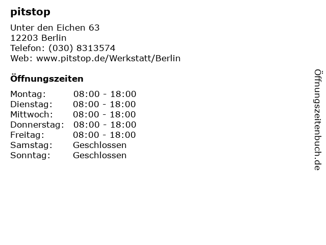 | Öffnungszeiten pitstop in Berlin anzeigen | |